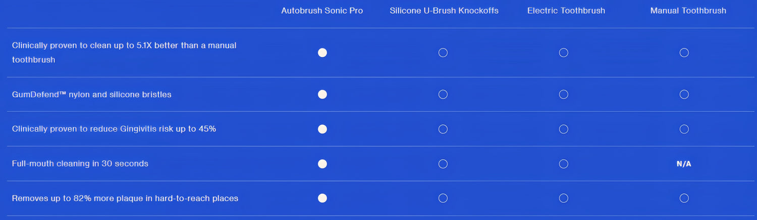 Meet the Autobrush Sonic Pro, the world's only ADA Accepted U-shaped electric toothbrush. Revolutionize your routine with a clinically proven 5.1X better clean in just 30 seconds. Its 360° sonic bristles perfectly surround teeth and gums for a gentle, spa-like clean. Perfect for busy lifestyles, this rechargeable, waterproof brush delivers a consistent, dentist-recommended clean effortlessly. Achieve superior oral health in seconds.