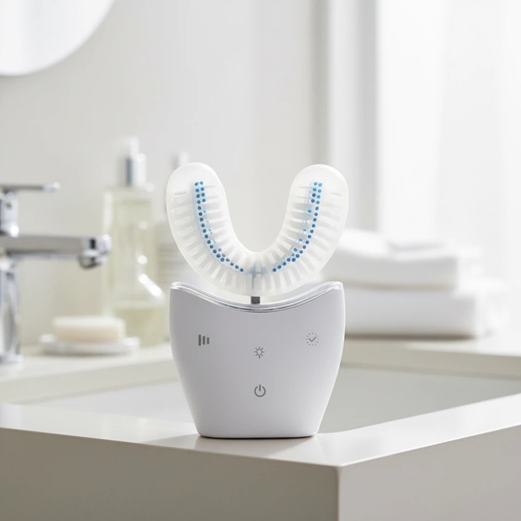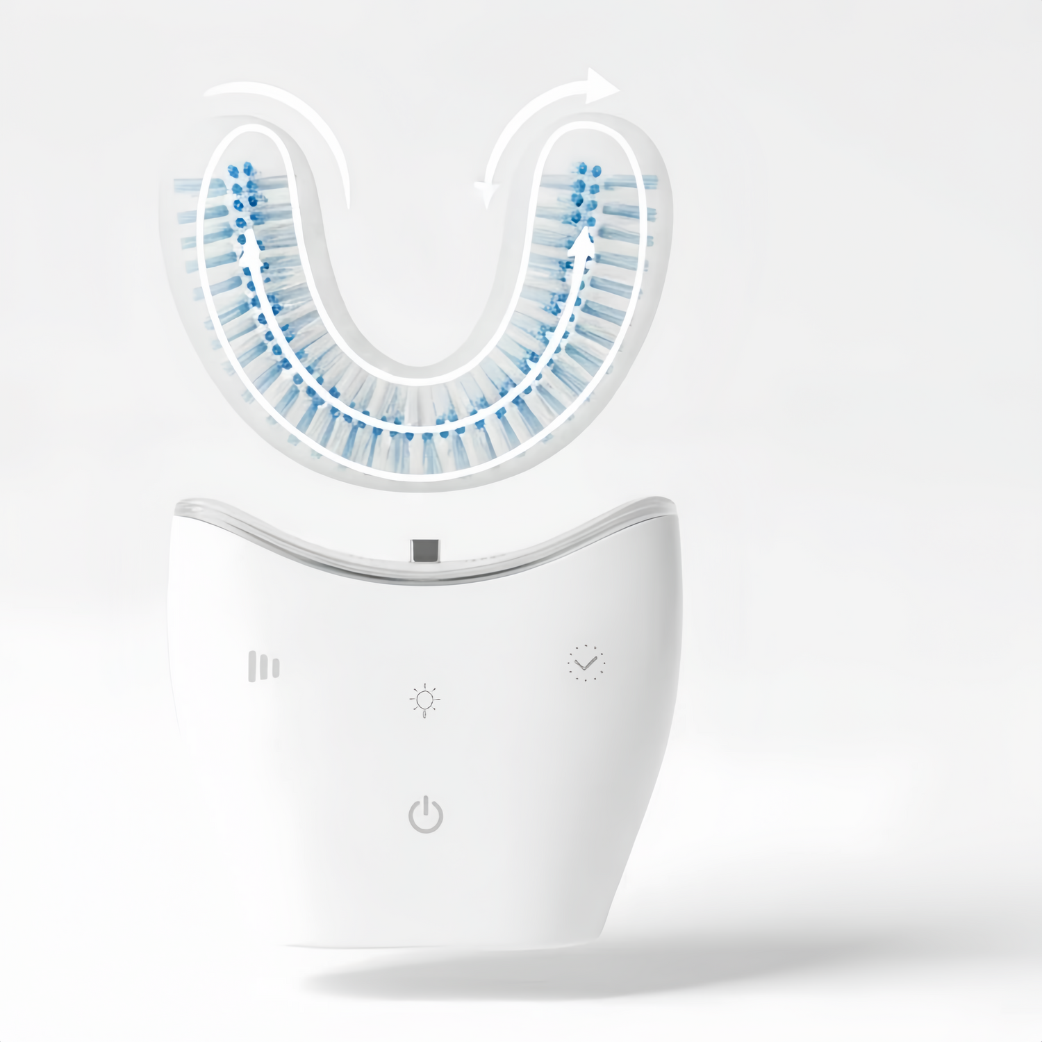 The Autobrush Sonic Pro works by fitting its unique U-shaped head over both your upper and lower teeth simultaneously. Its inner surface is lined with dense, soft sonic bristles. When activated, these bristles vibrate at a high sonic frequency. This motion creates a powerful, gentle 360° cleaning action that surrounds and cleans every surface of your teeth and gums—front, back, and chewing surfaces—all in just 30 seconds, emulating the effectiveness of expert flossing and brushing.
